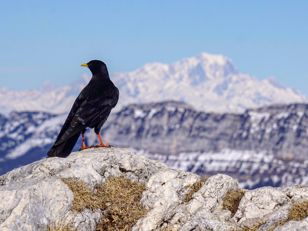 Title: Chocard à bec jaune sur fond de Mont Blanc