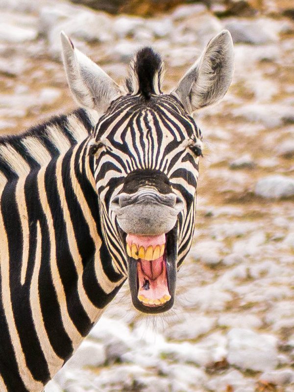 Description: Un zèbre se moque de moi lorsqu'il se rend compte que j'attends depuis deux heures, cachée dans ma voiture, qu'un éléphant vienne s'abreuver au plan d'eau.