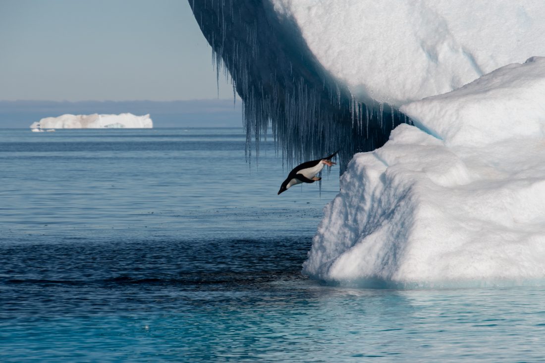 Description: Un manchot Adélie plonge depuis un iceberg, Antarctique