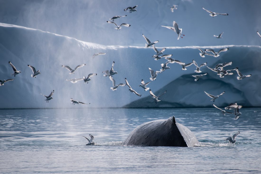 Description: Une baleine à bosse fait surface pour respirer avant de replonger pour se nourrir de petits poissons. Des oiseaux de mer en profitent pour manger les petits poissons qu´elle a ramenés à la surface.