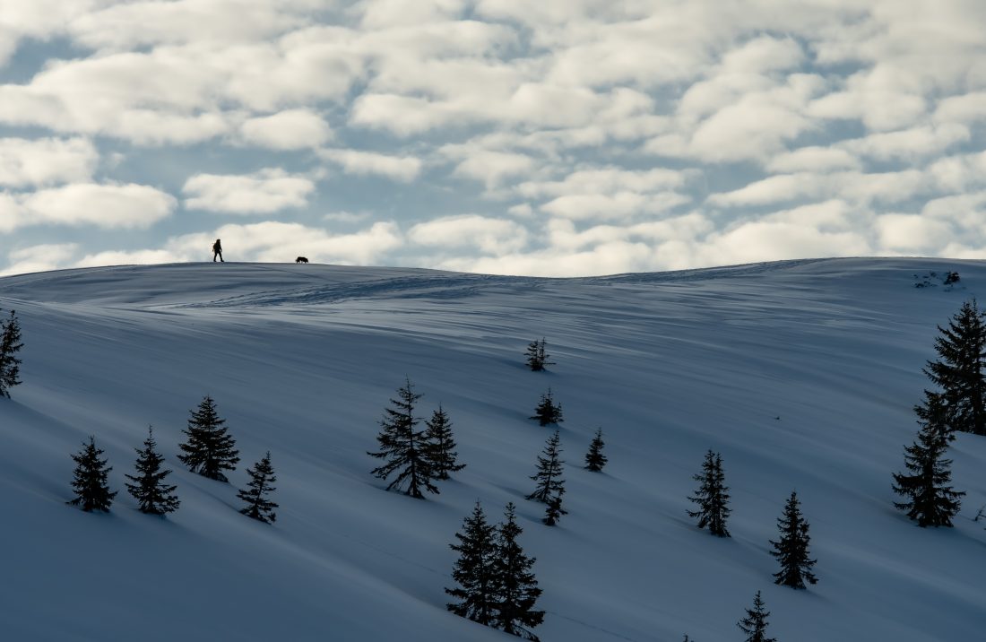 Description: Un début de journée sur l arrête d une crête enneigée , une Homme et son animal