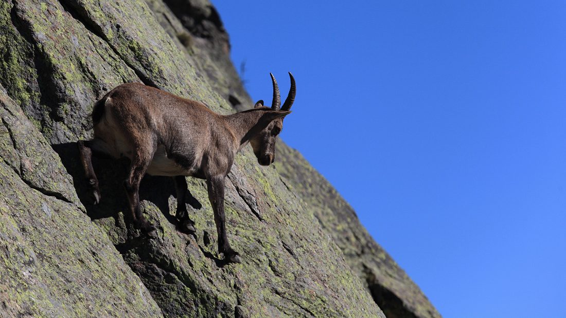Description: Bouquetin étagne au mur d'escalade de la réserve des Aiguilles Rouges