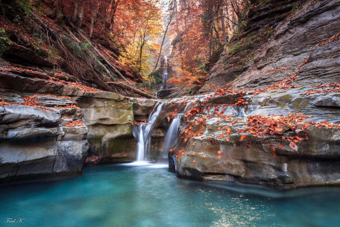 Description: Une petite retenue d’eau surmontée d’une cascade, trouvée par hasard lors d’une randonnée en montagne.