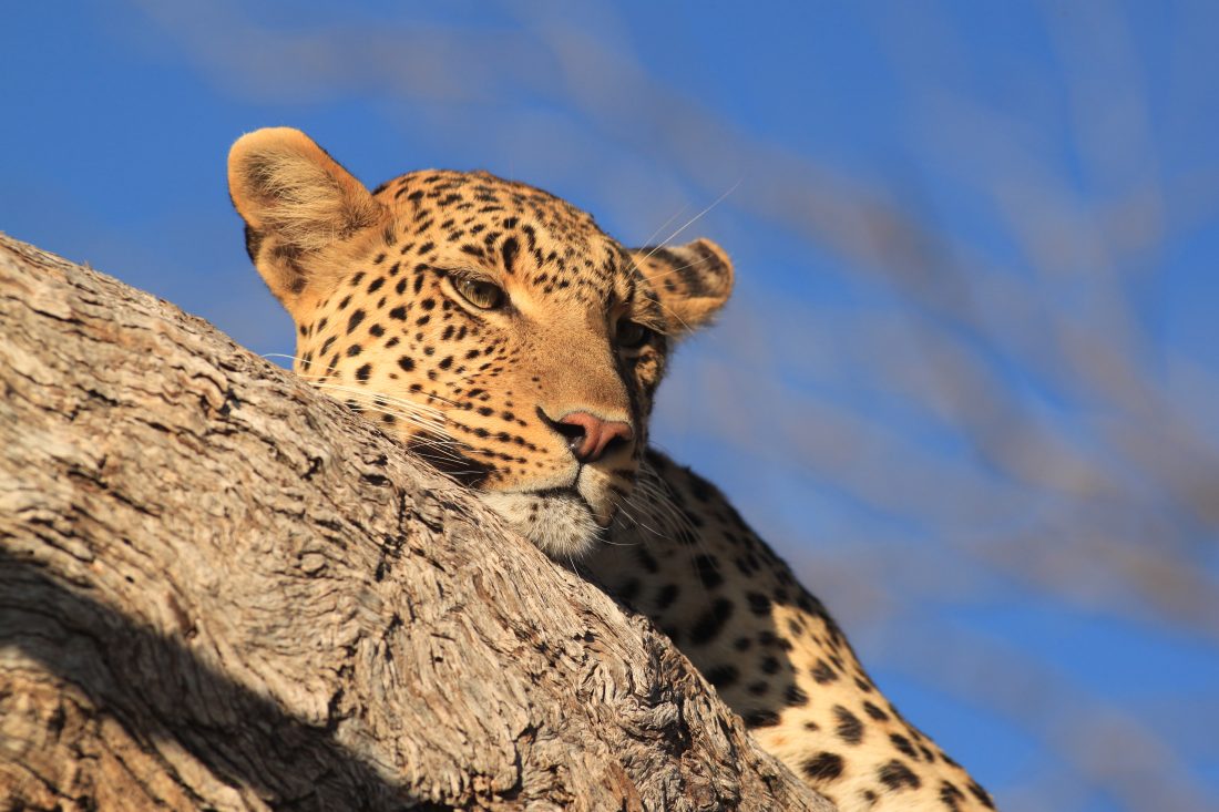 Description: Léopard profitant de la douce lumière du soir sur sa branche.