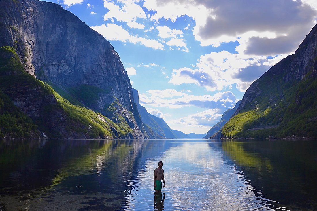 Description: Les lumières obscures tracent le chemin de l'immensité des fjords norvégien.