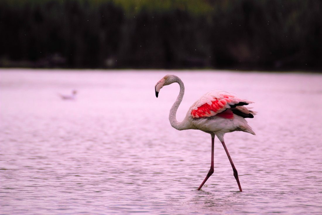 Description: cliché d'un flamant rose camarguais lors d'un couché de soleil ensoleillé.
