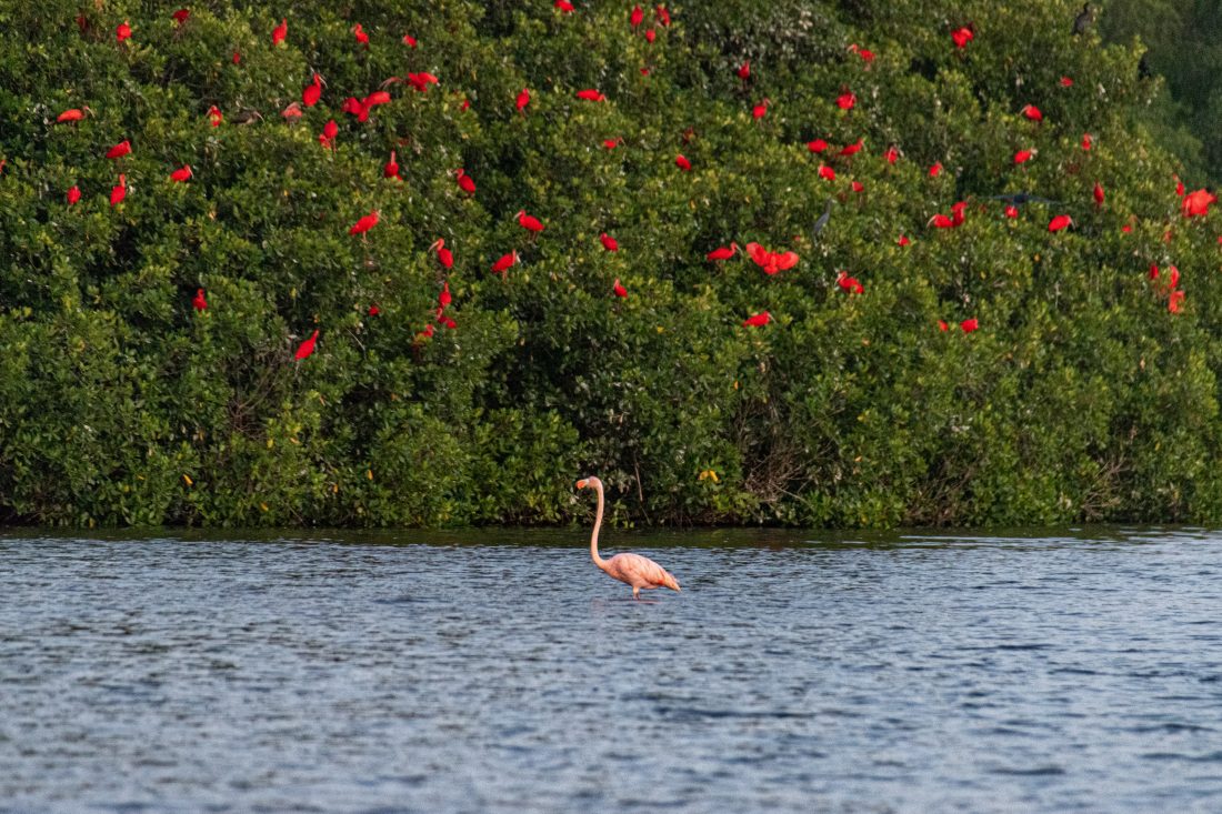 Description: Flamant rose et des ibis rouges écarlates à Trinité et Tobago