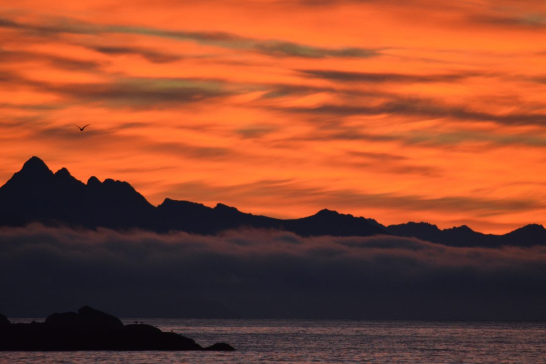 Description: Rougeoiement du ciel peu avant le lever du soleil dans la nuit polaire de la fin Août 2016 aux iles Lofoten. Réveil à 3H00 du matin pour capter les effets de brume sur le Fjord, un oiseau est venu compléter le tableau.