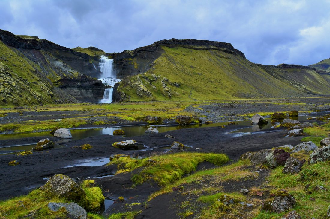 Description: La vallée d'Elggja se situe aux portes du Landmanalaugar en Islande, elle a été formée par une ouverture de la terre sur plusieurs dizaines de kilomètre lors d'une éruption volcanique. Une ancienne rivière qui traversait le plateau a formé une cascade qui s'école ensuite dans la vallée