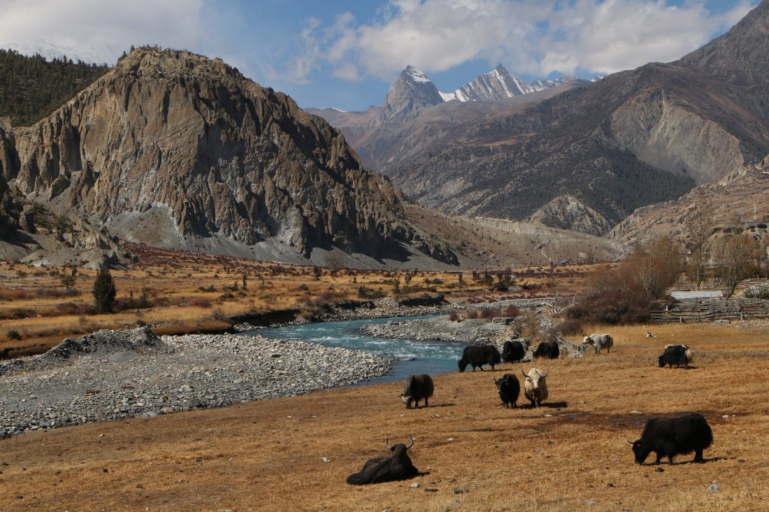 Description: Photo prise à l'entrée de la ville de Chame (2670m). On peut apercevoir un troupeau de yacks en semi liberté en train de paître avec la montagne en toile de fond (Annapurna II). Il n'existe pas de yacks en liberté.