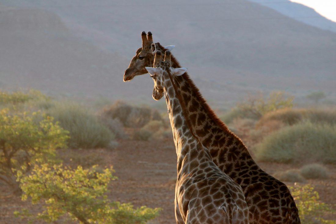 Description: Couple de girafes prise au lever du soleil dans le désert du Namib en Namibie.