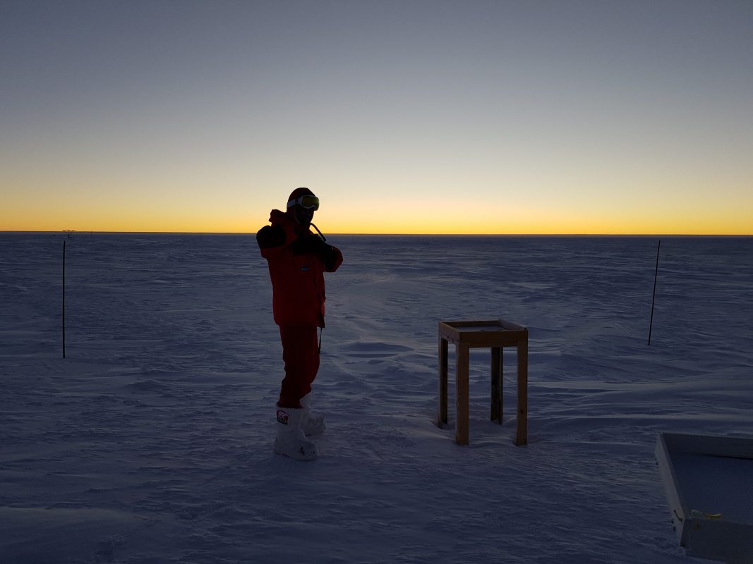 Description: Glaciologue et chef de base Cyprien Verseux au début de la nuit polaire près de la base Concordia en Antarctique.