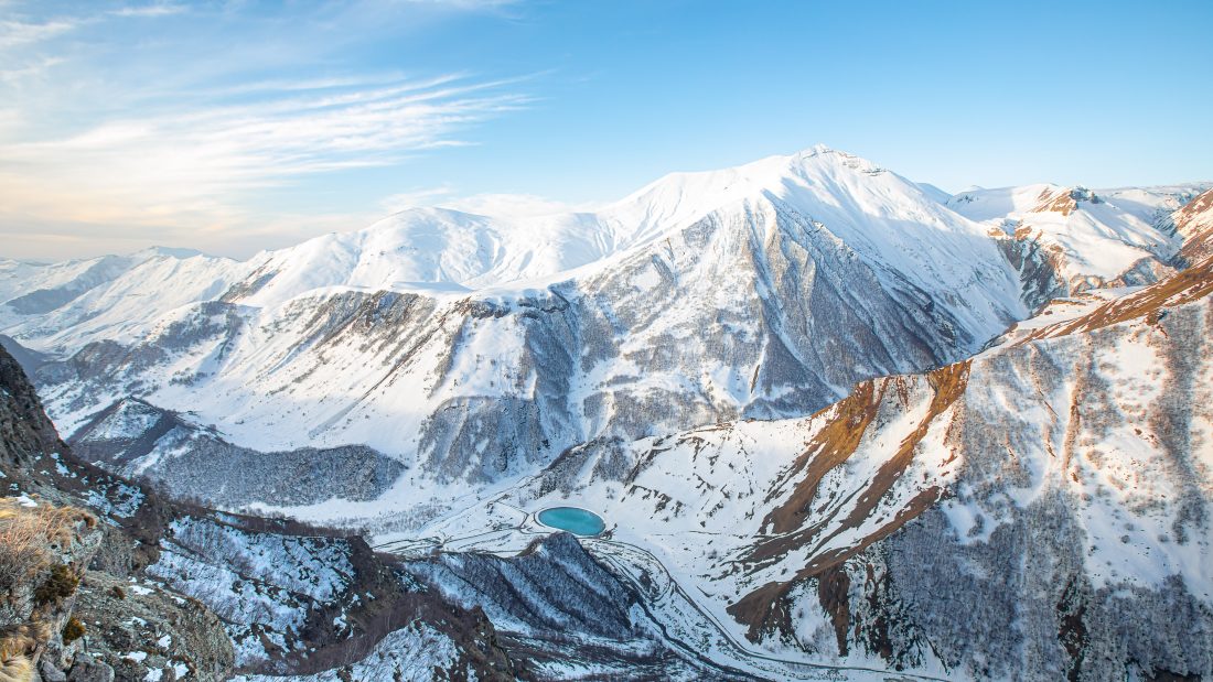 Description: Une randonnée enneigée sur les hauteurs du Caucase, avec une vue sur la vallée au soleil levant.