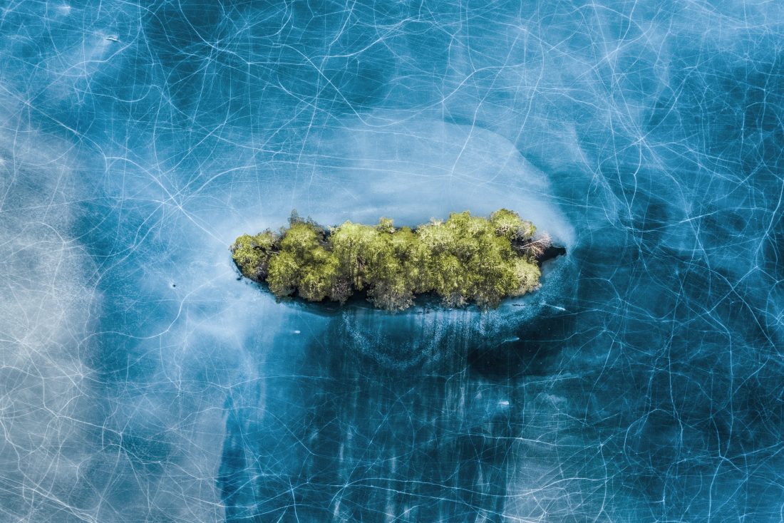 Description: Au cours d'une marche en Suède, nous avons croisé une rivière gelée à la glace d'un bleu intense, et en son milieu, un îlot verdoyant. Mon drone m'a permis de saisir cette scène depuis le ciel.