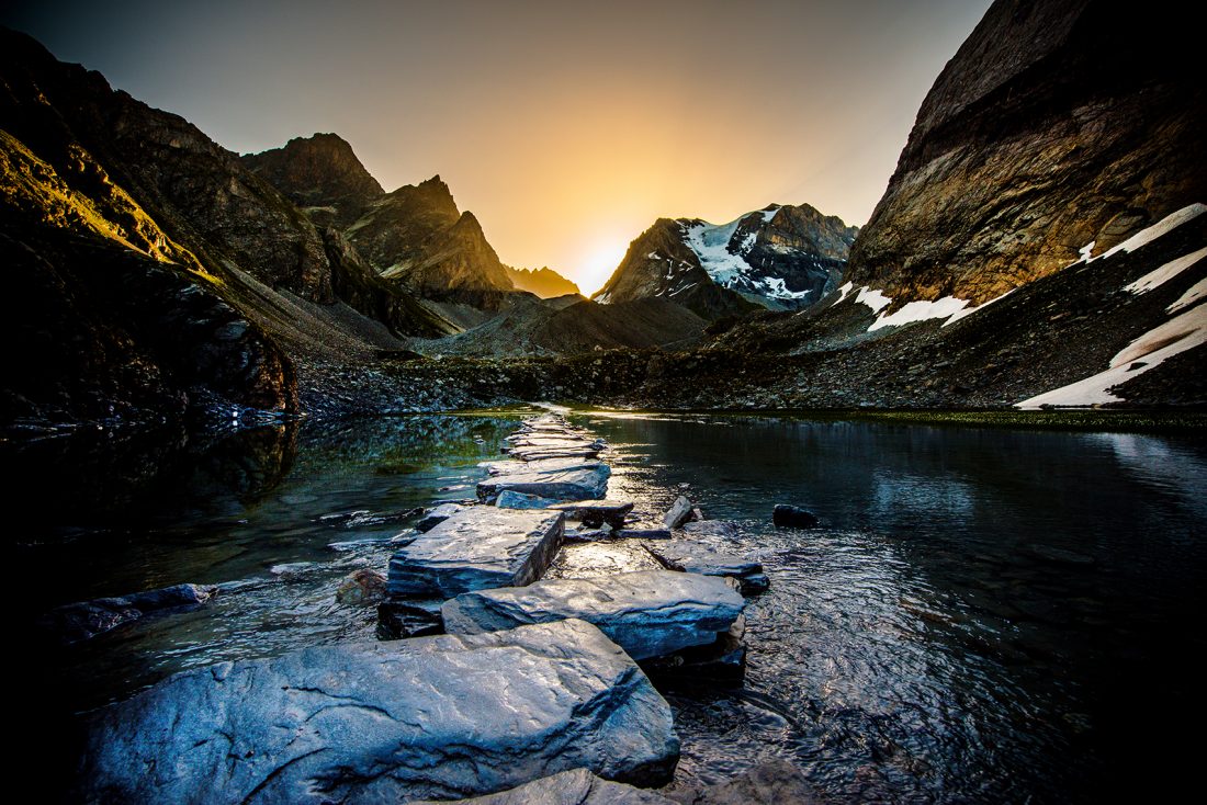 Description: le soleil se léve sur le lac des vaches ,accés au col de la Vanoise et au parc national du même nom