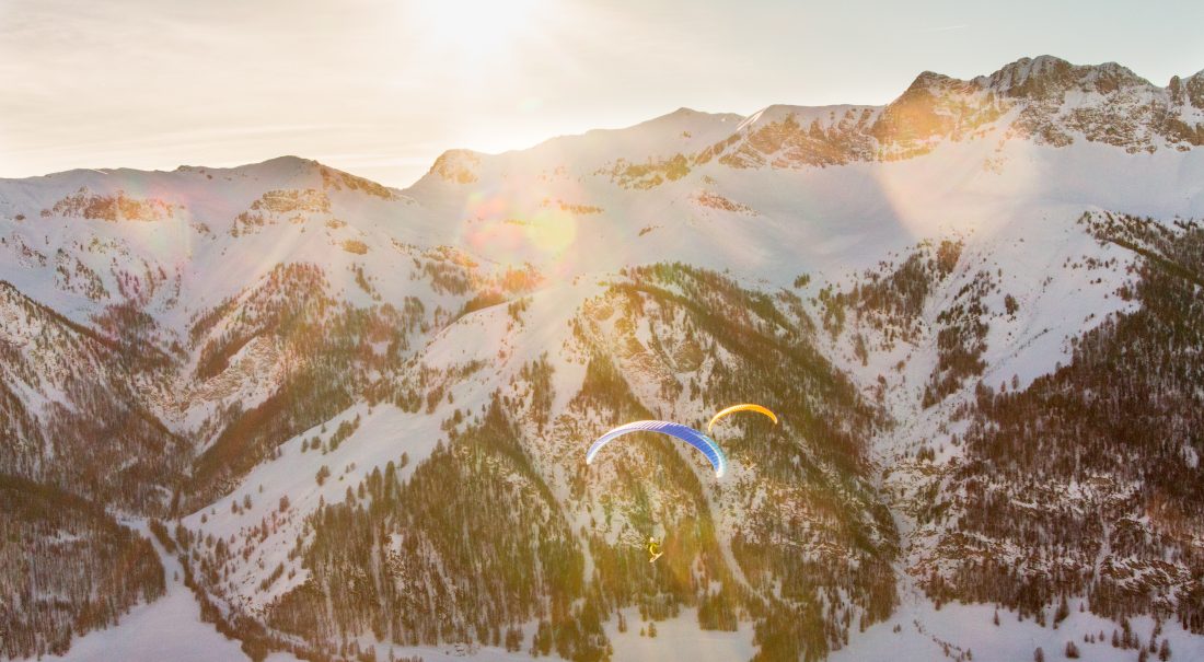 Description: Après une belle journée de ski, les copains decident de rentrer en parapente depuis le haut du domaine skiable de Molines en Queyras, un couché de soleil et le temps suspendu pendant le décollage, émerveillement d'une fin de journée. Quand tout s'aligne pour donner un instant contemplatif.