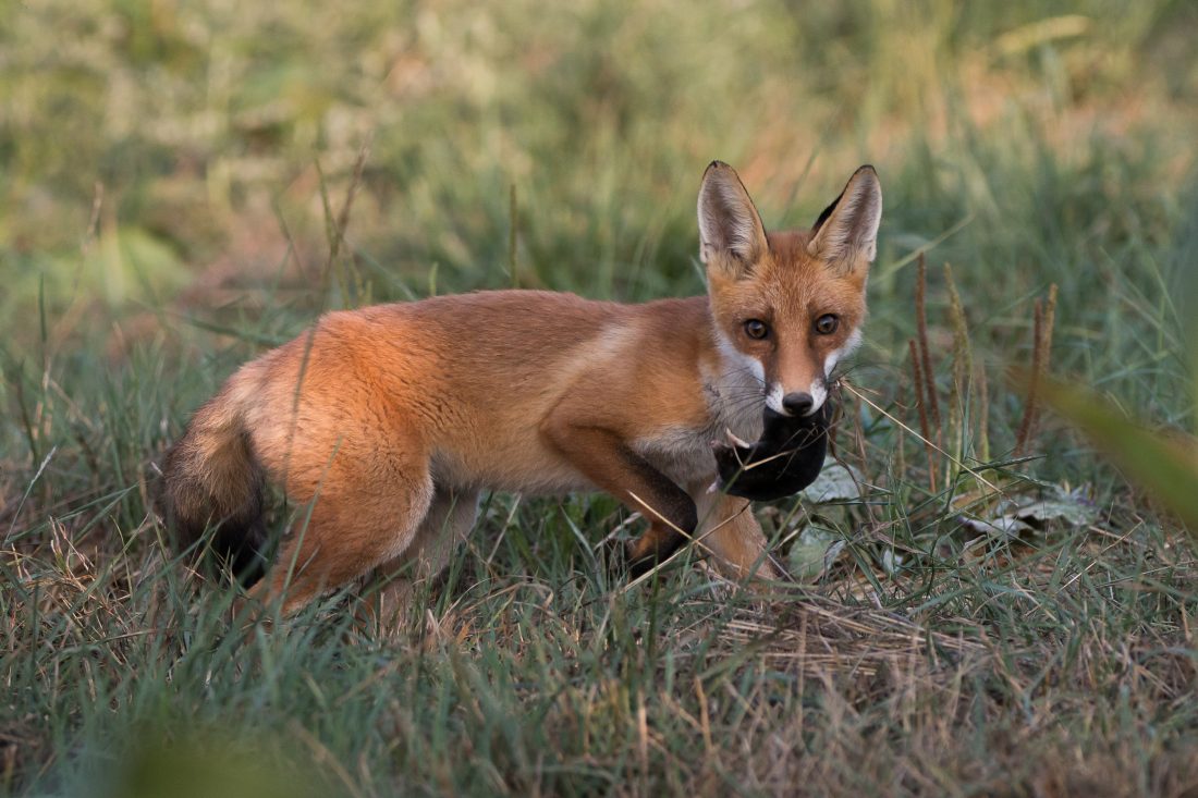 Description: un soir d'été , rencontre avec un jeune renard de l'année en plein apprentissage de la chasse