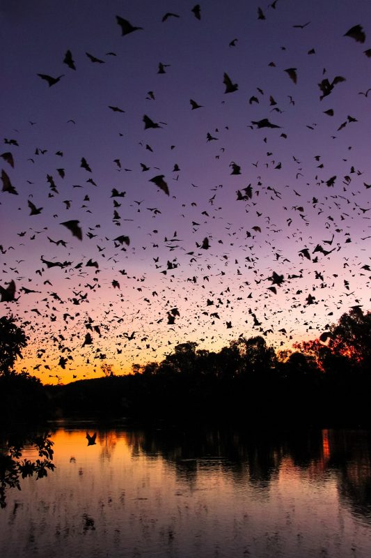 Description: Un envol surprenant à la tombé de la nuit de centaines de chauve-souris.