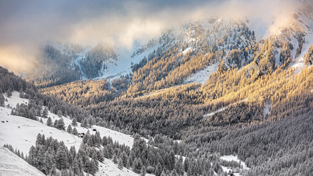 Description: Quand on pense que l'hiver est terminé et qu'une petite couche de neige tombe durant la nuit, on peut avoir de très belles surprises. Ce matin-là, les nuages étaient juste au-dessus du village de Saint-Véran laissant ainsi un fin rayon lumineux passer entre ces nuages et les mélèzes…