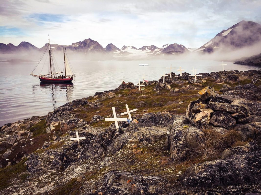 Description: Brume matinale entourant la magnifique île de Kulusuk au sud-est du Groenland