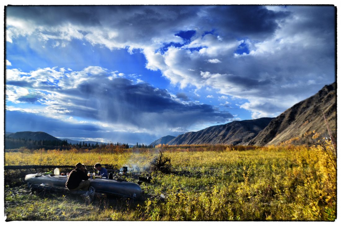 Description: Lors de notre expédition en Canoë au Yukon, nous installions notre campement chaque soir et nous retournions nos canoës pour nous servir de table .