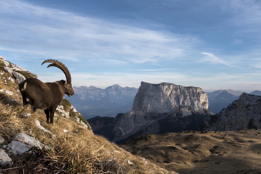 Description: Lors d'une randonnée pédestre avec le majestueux Mont Aiguille toujours à vue. La première prise de vue fait partie de mes préférées, à la descente avec une lumière douce de fin de journée et ma batterie dans le rouge à 5% d'autonomie restant, je m'approche lentement en croisant les doigt pour que ce bouquetin reste encore avec moi quelques instants. Il était gentil, il me regardait, je l'admirais, en deux clichés ma photo était dans le boitier.