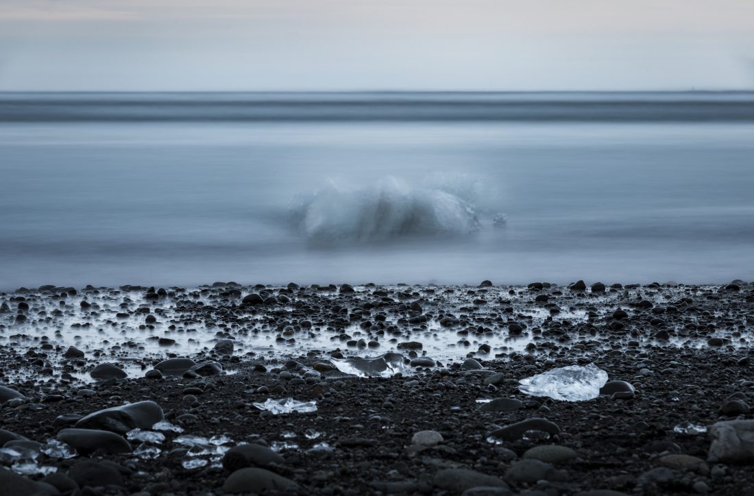 Description: Un bloc de glace coincé dans la mer qui lutte malgré la force des vagues.