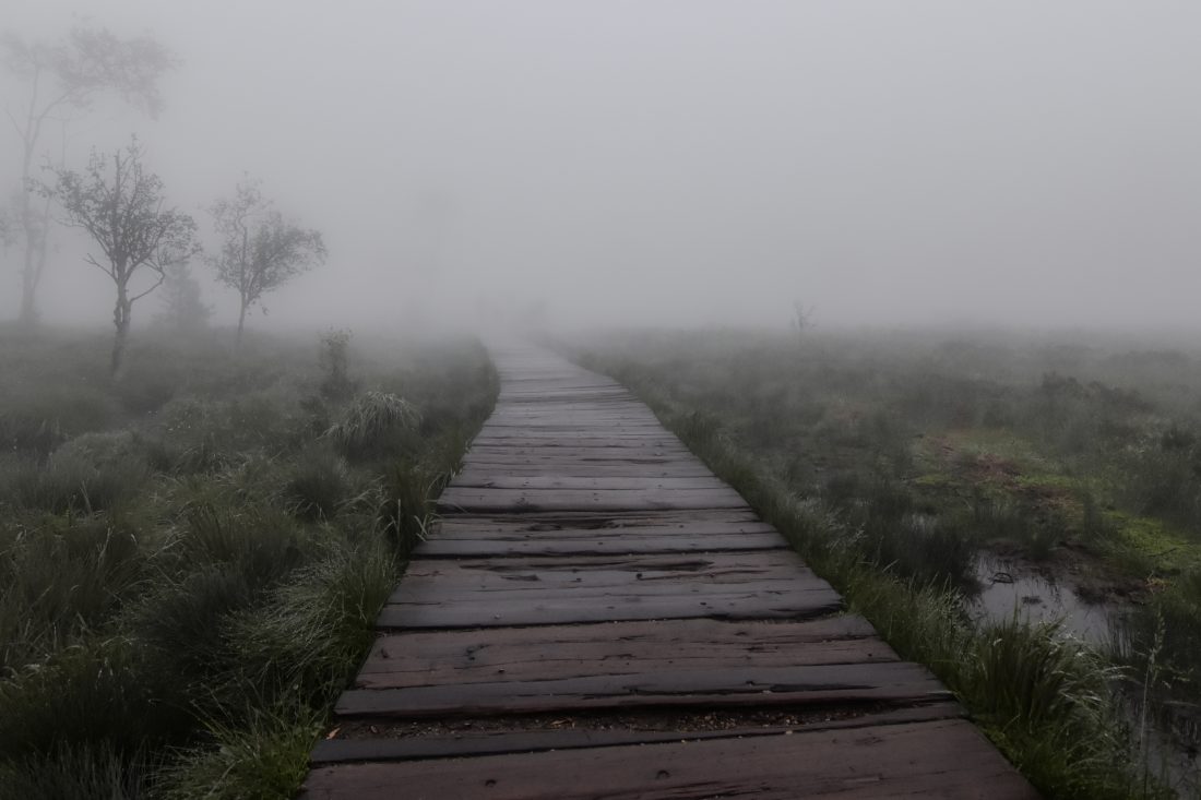 Description: Randonnée sur le sentier du Preikestolen dans les fjords norvégiennes, un des endroits les plus beaux du pays envahi par le brouillard.