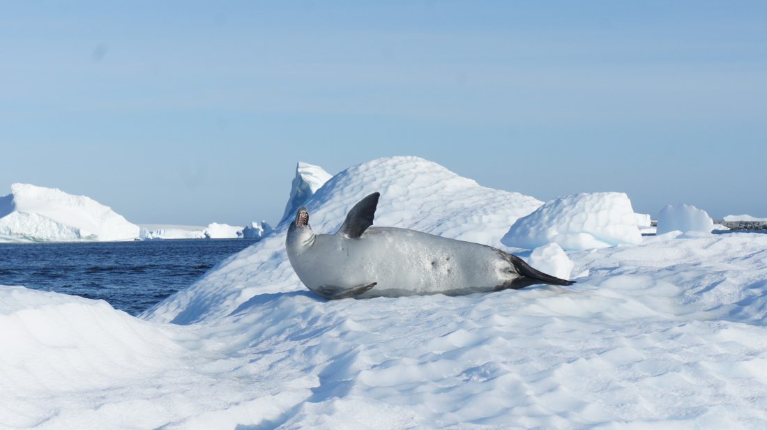 Description: En se baladant dans le jardin des icebergs, des rencontres inattendues se réalisent : un phoque crabier allongé sur son bout de glace se réveille et nous salue.