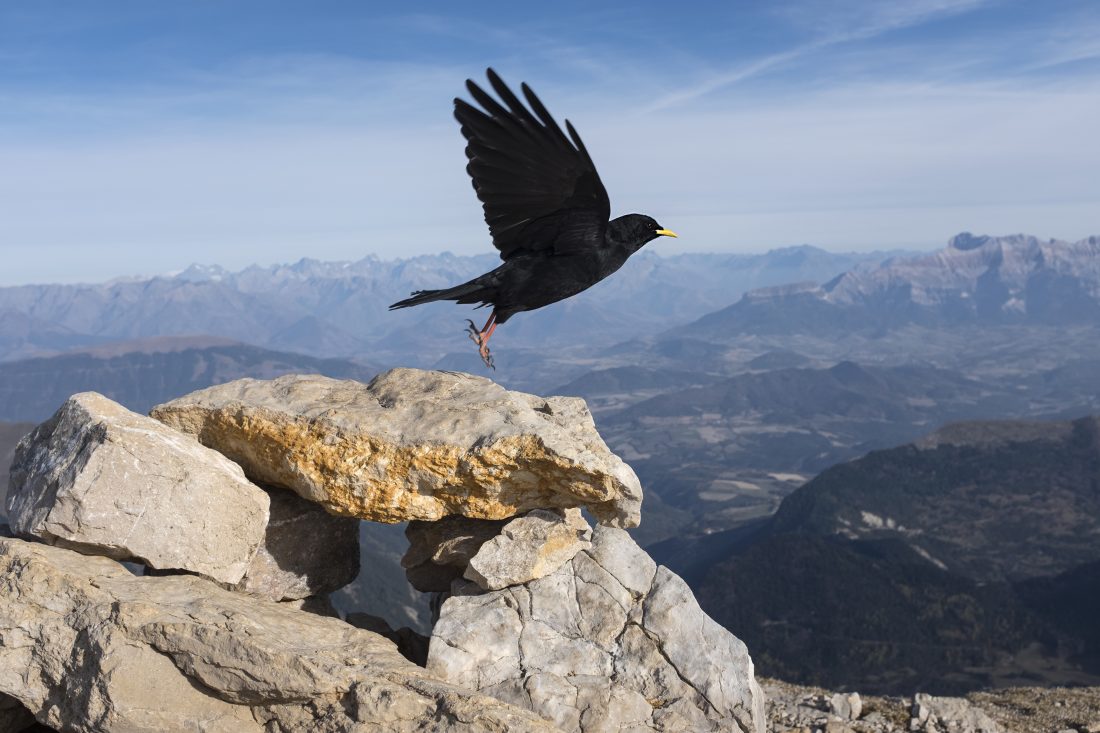 Description: J'aime les séquences photographiques. Cette série de trois clichés d'un Chocard à bec jaune me plait car on peut faire allusion à l'aspect historique du Vercors. L'oiseau décolle subitement d'un vestige des batailles de la 2em Guerre Mondiale. Un emplacement de tir Allemand, lesquels contrôlaient le Grand Veymont un temps, comme si l'oiseau entendait la détonation.