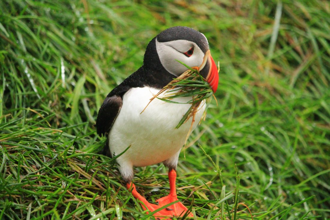 Description: Colonie de centaines de macareux qui se retrouve tous les ans pour la saison des amours sur cette colline isolée au bord de l'eau
