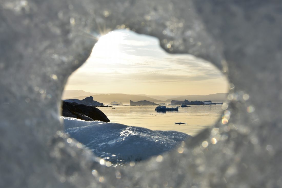 Description: Vue du fjord Sermilik, dans l'est du Groenland depuis un iceberg échoué sur la plage.