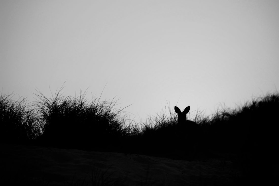 Description: Un kangourou qui passait au milieu des herbes à la tombée de la nuit.