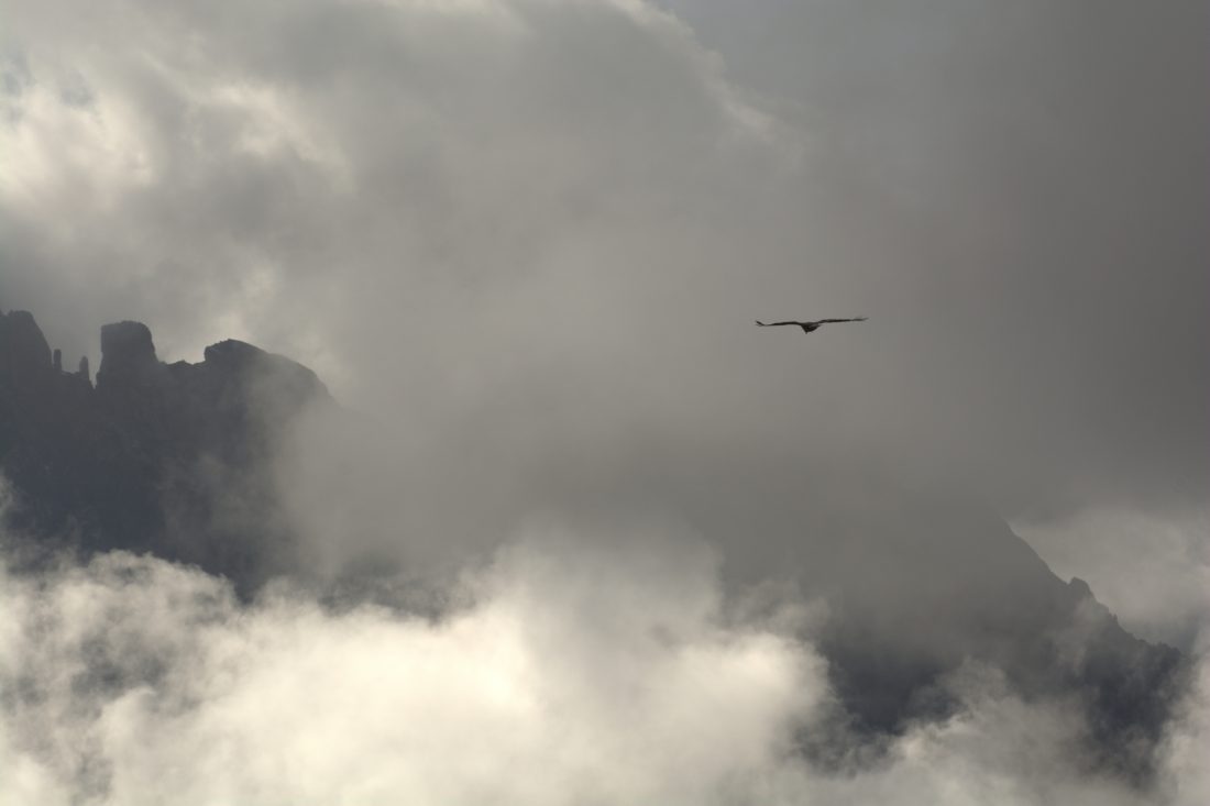 Description: Silhouette d’aigle royal sur fond de nuages et montagnes. Aigle m’ayant survolé à une dizaines de mètres pendant que je photographiais 2 bouquetins. Le temps que je réalise et réagisse pour l’avoir dans mon viseur, il était déjà loin mais cela m’a permis de prendre cette belle photo.