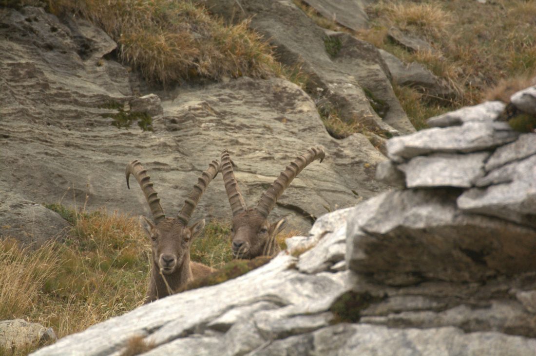Description: Deux bouquetins mâles ruminants côte à côte. scène pour moi inédite