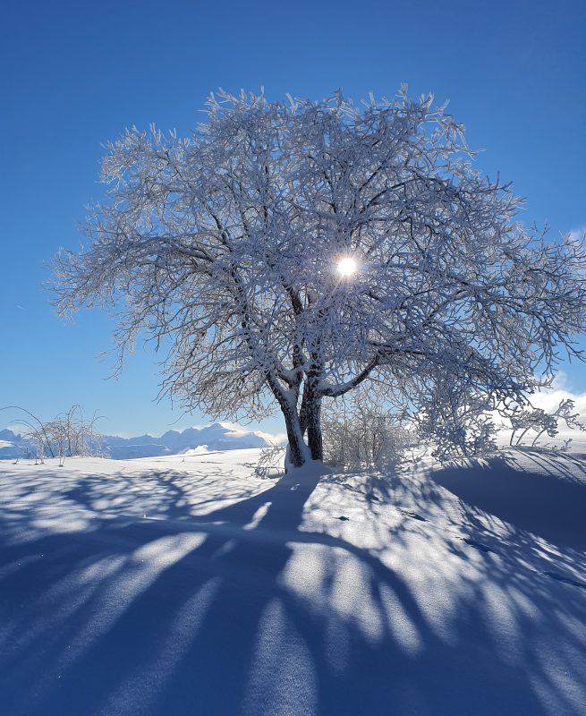 Description: Arbre givré illuminé devant le Mont-Blanc