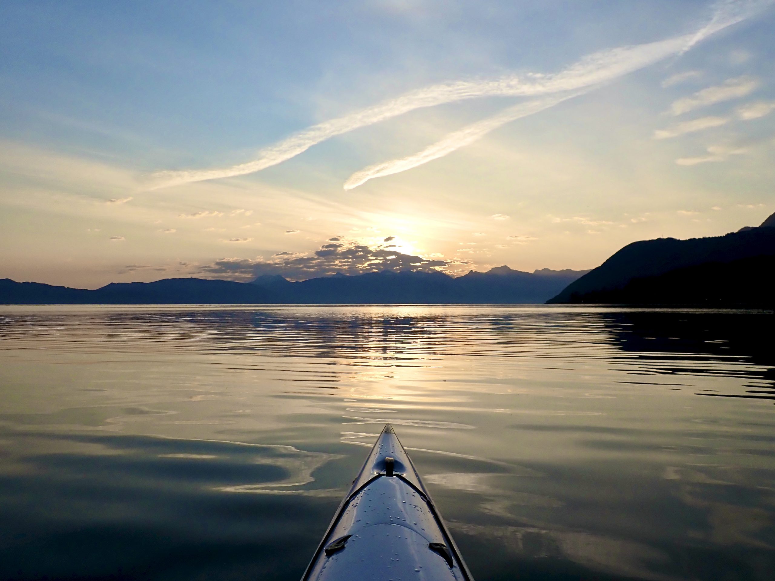 Description: Rando kayak sur le leman, en direction des Alpes, au lever du soleil.