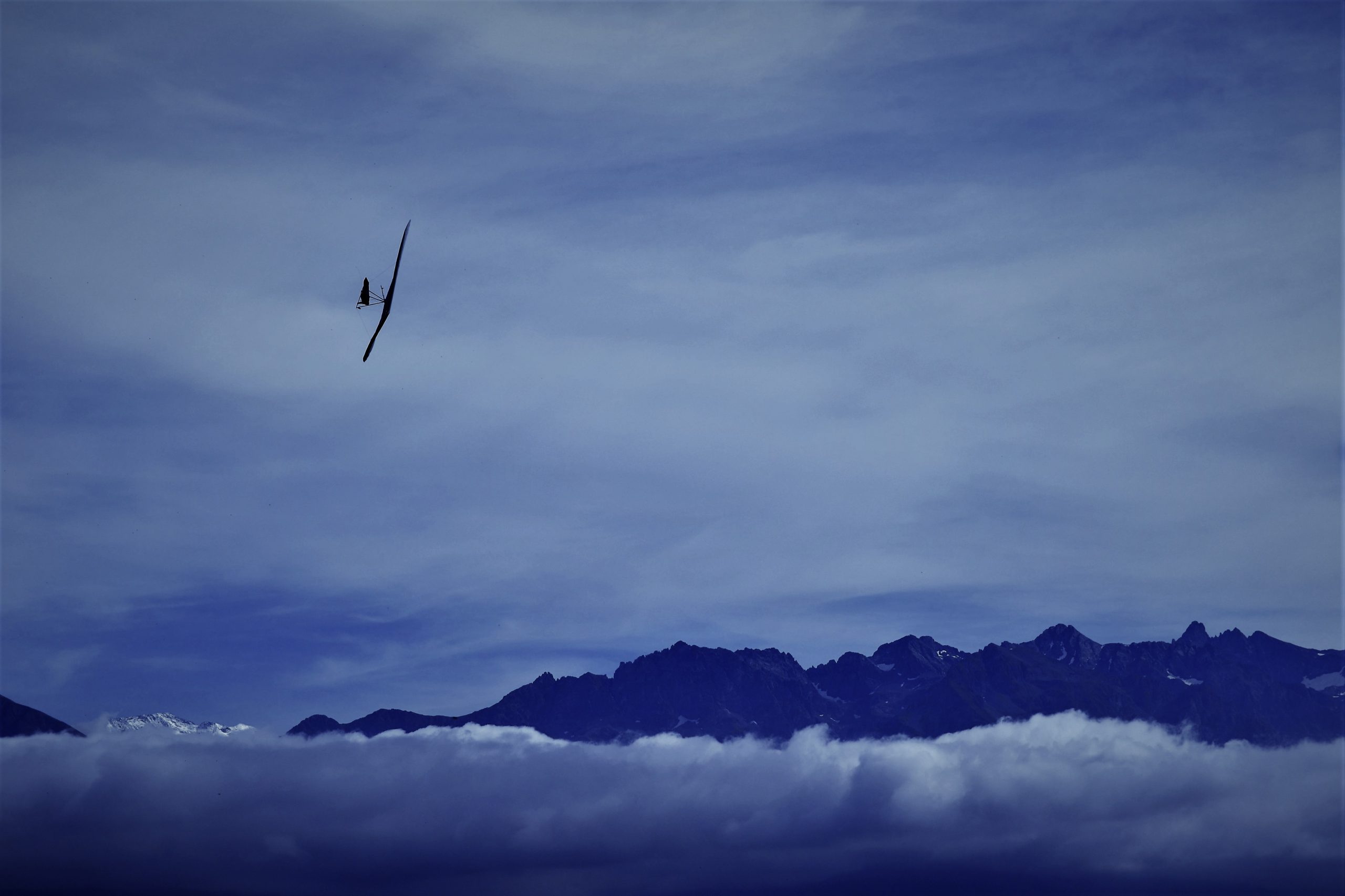 Description: Vol en deltaplane au départ de saint Hilaire du Touvet, avec le massif de Belledonne en toile de fond.