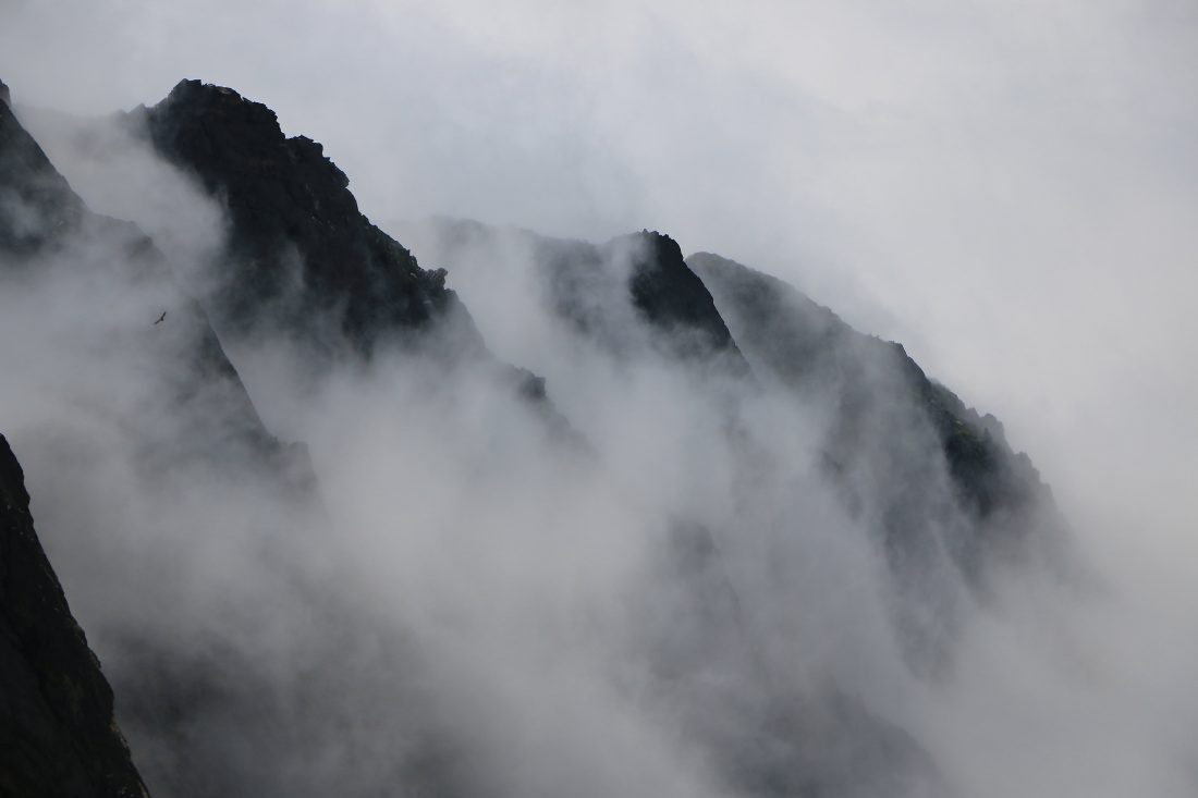 Description: Quand la montagne joue avec la brume pour dévoiler ses formes. Un vautour fauve semble se prendre au jeu.