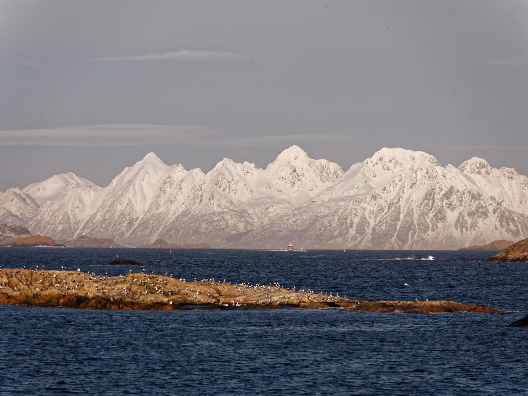 Description: Lofoten : Depuis le port de pêche de Henningsvaer en Norvège, on distingue les montagnes du continent semblant surgir de la mer