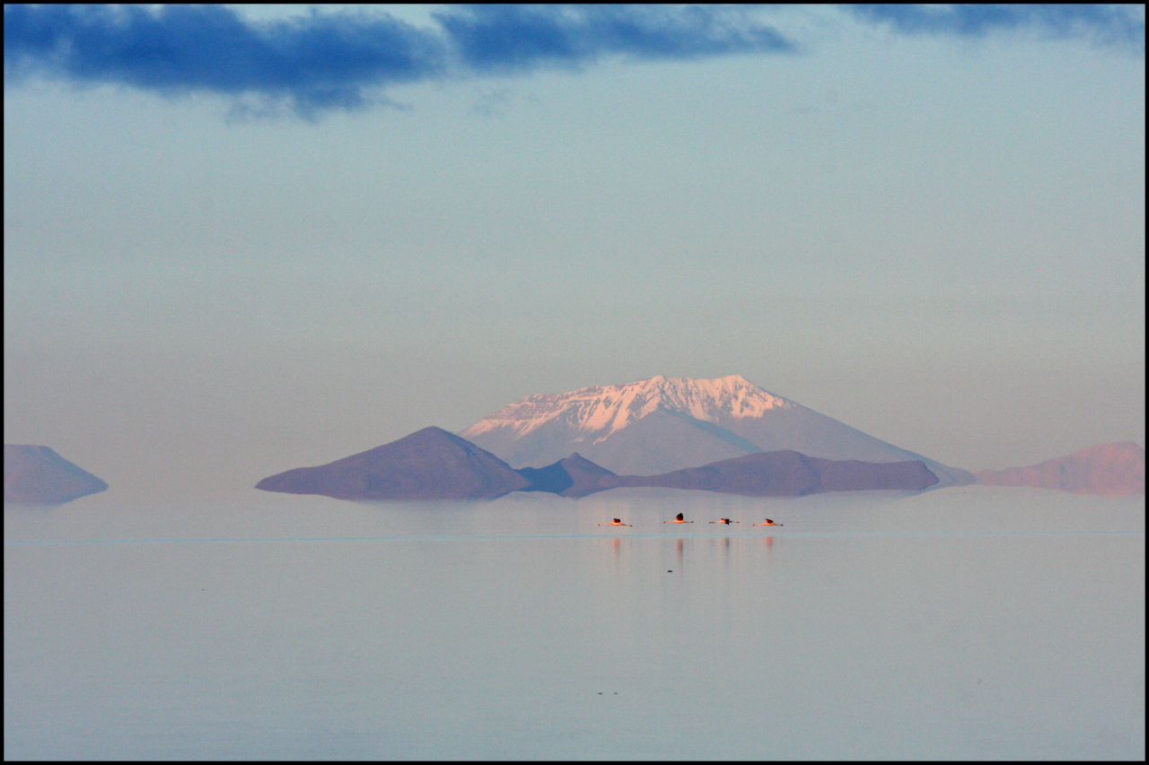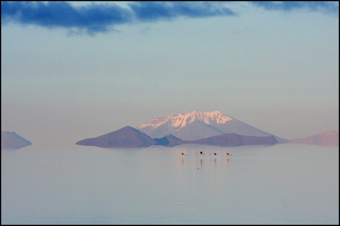 Description: Lever aux aurores sur le salar d'Uyuni en pleine saison des pluies. Dans les premiers rayons du soleil, les sommets des Andes flottent au dessus de l'eau. L'ambiance semble irréelle. J'arme mon appareil photo quand quatre flamands roses traversent le paysage.