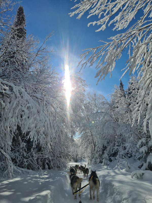 Description: Balade enneigée en chiens de traineau dans les Laurentides au Québec