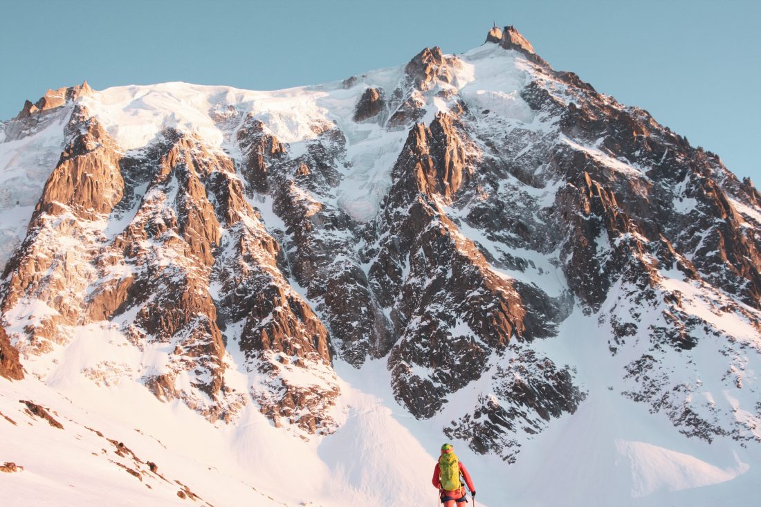 Title: Ski de randonnée sous l'Aiguille du Midi au soleil couchant