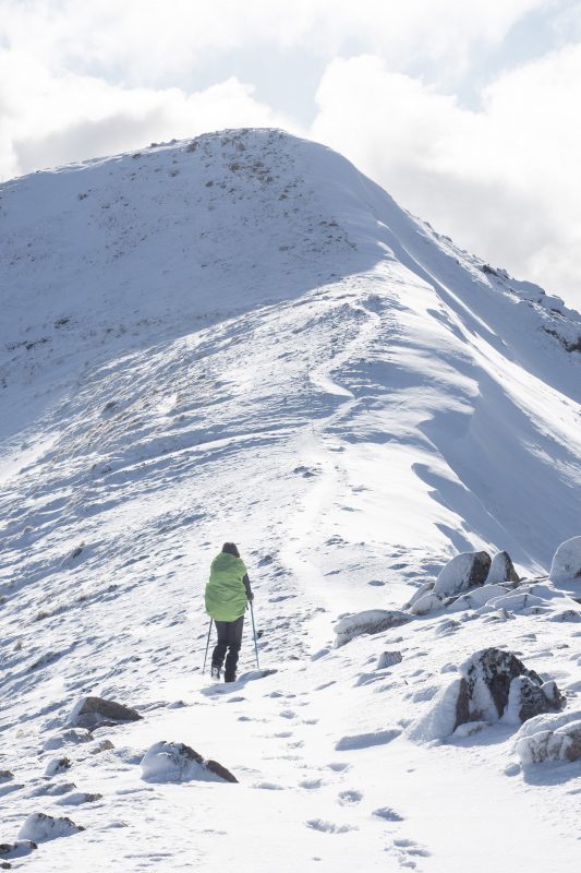 Description: Plus nous grimpons et plus la quantité de neige augmente, jusqu'à atteindre nos genoux. Chaque pas est un effort que les paysages qu'on découvre nous font immédiatement oublier… On ne croise personne et les seules traces fraîches sont celles d'un lapin et d'un chamois. Le privilège de marquer la neige immaculée de nos pas solitaires renforce la beauté du moment…