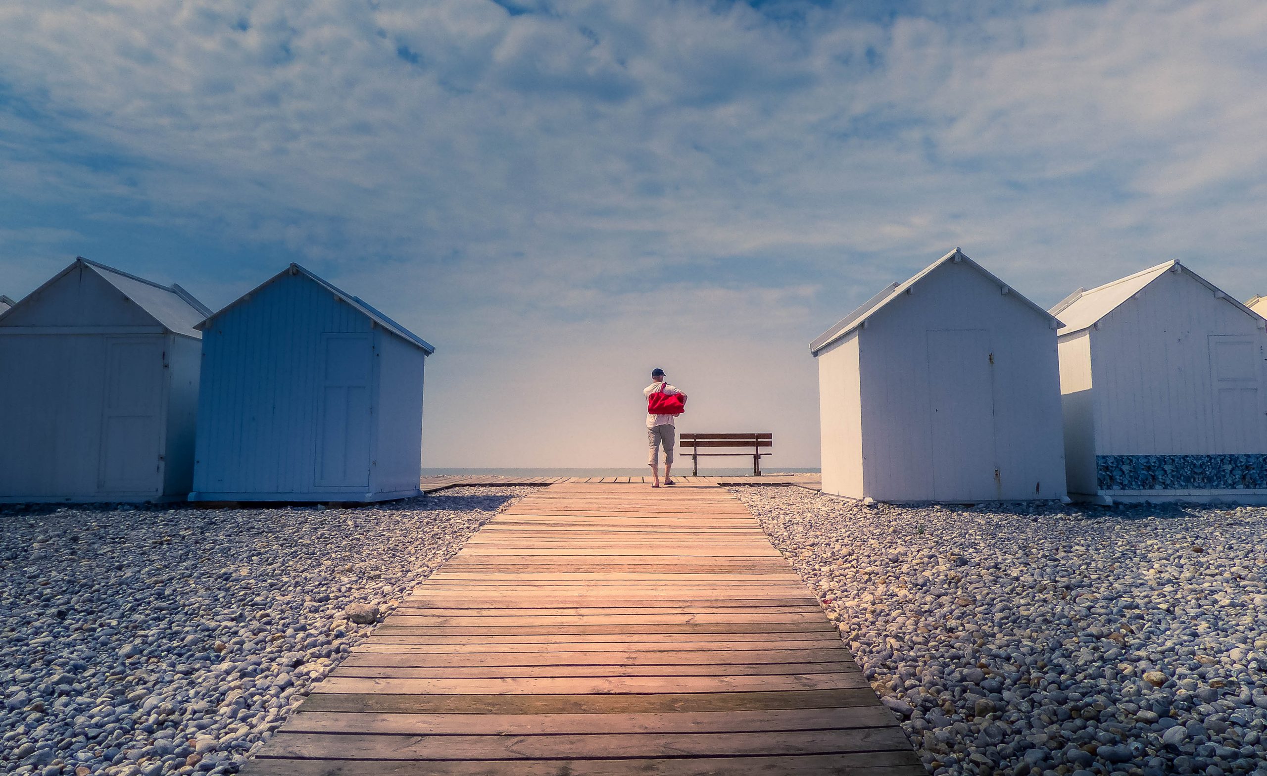 Description: un homme seul se dirige vers la plage pour se baigner par une douce journée d'été