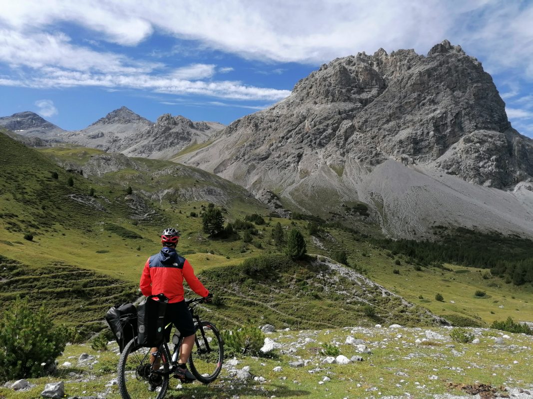 Description: Traversée de l'arc alpin à vélo en autonomie. 26 jours et 1500 km de la Slovénie à Gap. Photo prise en août sur le plateau Suisse Val Mora à 2200 m.