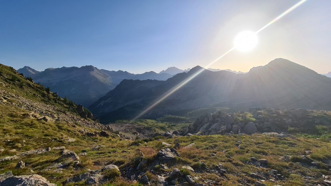 Description: Pause photo matinale depuis le Mont Pépoiri – 2674 m, point culminant du trail des Lacs des Millefonts (26 km, 1965 m D+)