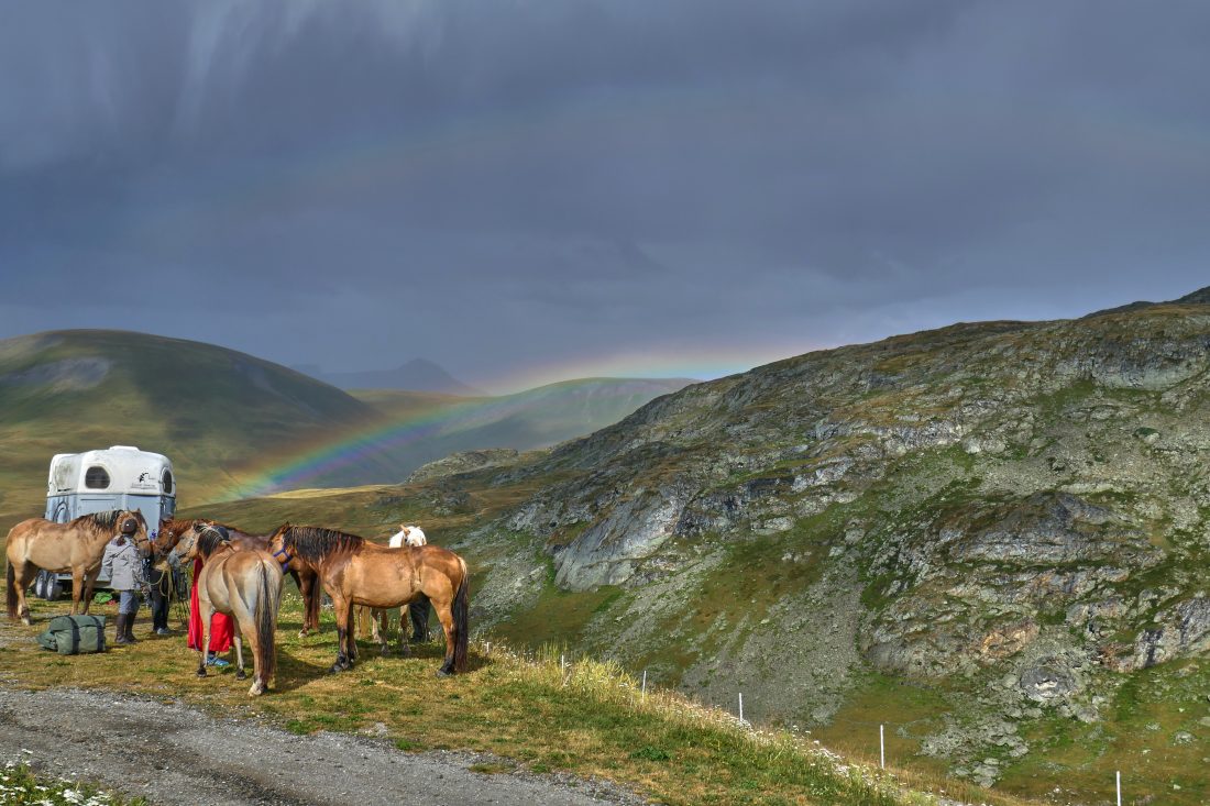 Description: Photo d'un groupe de randonneur à cheval en itinérance sur plusieurs jours à travers les Alpes.
