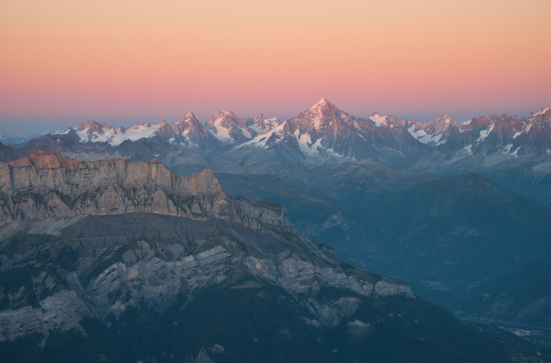 Title: lever de soleil sur les drus,les aiguilles de Chamonix et la chaine des Fiz en avant plan.
